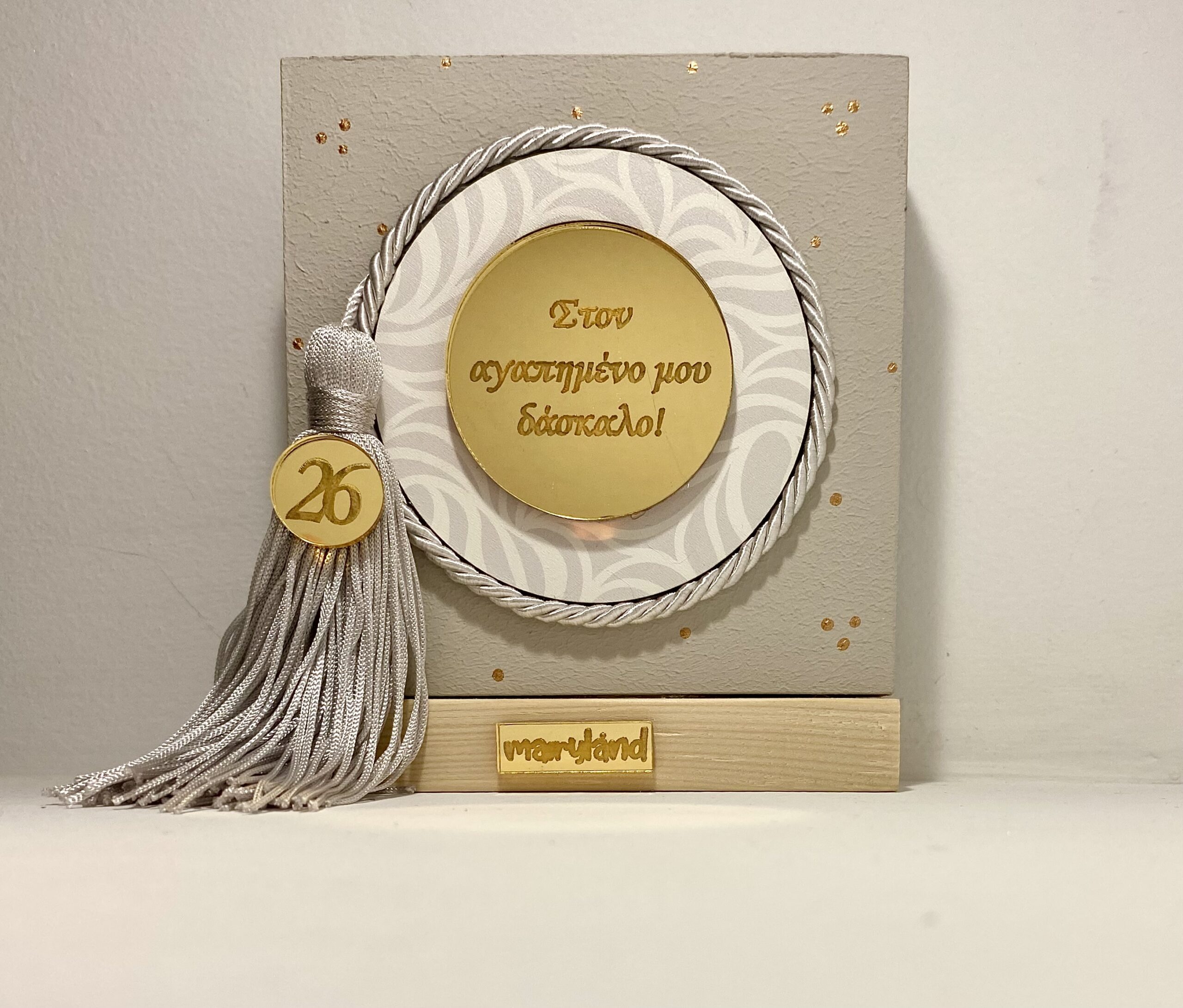 Στο κέντρο του κυριαρχεί χρυσός δίσκος από plexiglass, στον οποίο μπορείτε να χαράξετε προσωπική ευχή, όνομα ή ιδιότητα. Η elegant σειρήτινη κορδέλα που πλαισιώνει τον κύκλο, μαζί με την εντυπωσιακή ασημί φούντα, δημιουργούν ένα refined αποτέλεσμα.