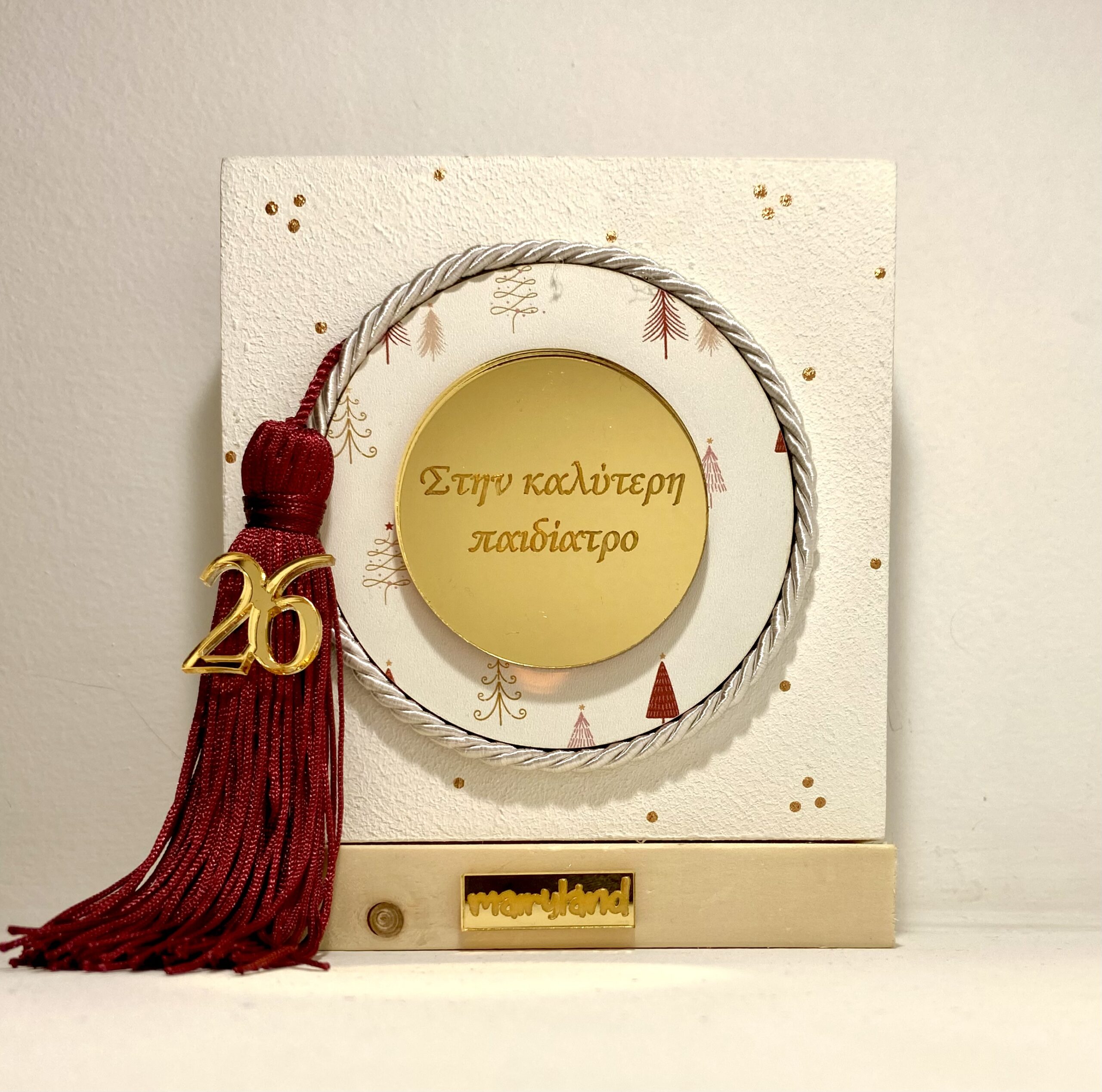 Στο κέντρο συναντάμε χρυσό δίσκο από plexiglass, επάνω στον οποίο μπορεί να χαραχθεί ευχή, όνομα ή ιδιότητα της επιλογής σας. Το γιορτινό μοτίβο με χριστουγεννιάτικα δεντράκια χαρίζει festive χαρακτήρα, ενώ το ασημί σχοινάκι πλαισιώνει αρμονικά το σχέδιο.