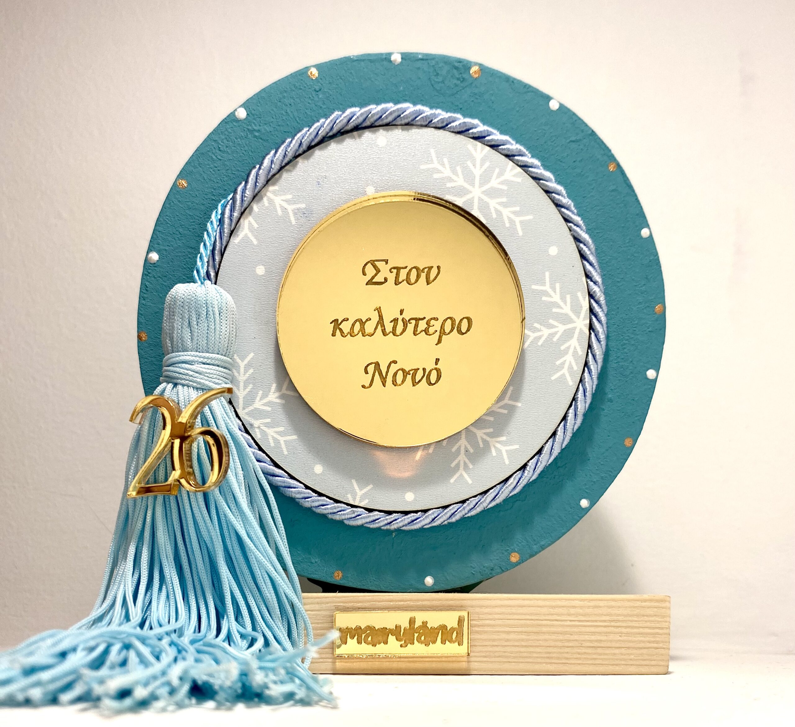 Στο κέντρο του βρίσκεται χρυσός δίσκος από plexiglass, όπου μπορείτε να χαράξετε ευχή, όνομα ή ιδιότητα, προσφέροντας προσωπική πινελιά. Το υφασμάτινο μοτίβο με χιονονιφάδες προσθέτει festive winter χαρακτήρα, ενώ το διακοσμητικό κορδόνι δίνει κομψότητα και υφή.