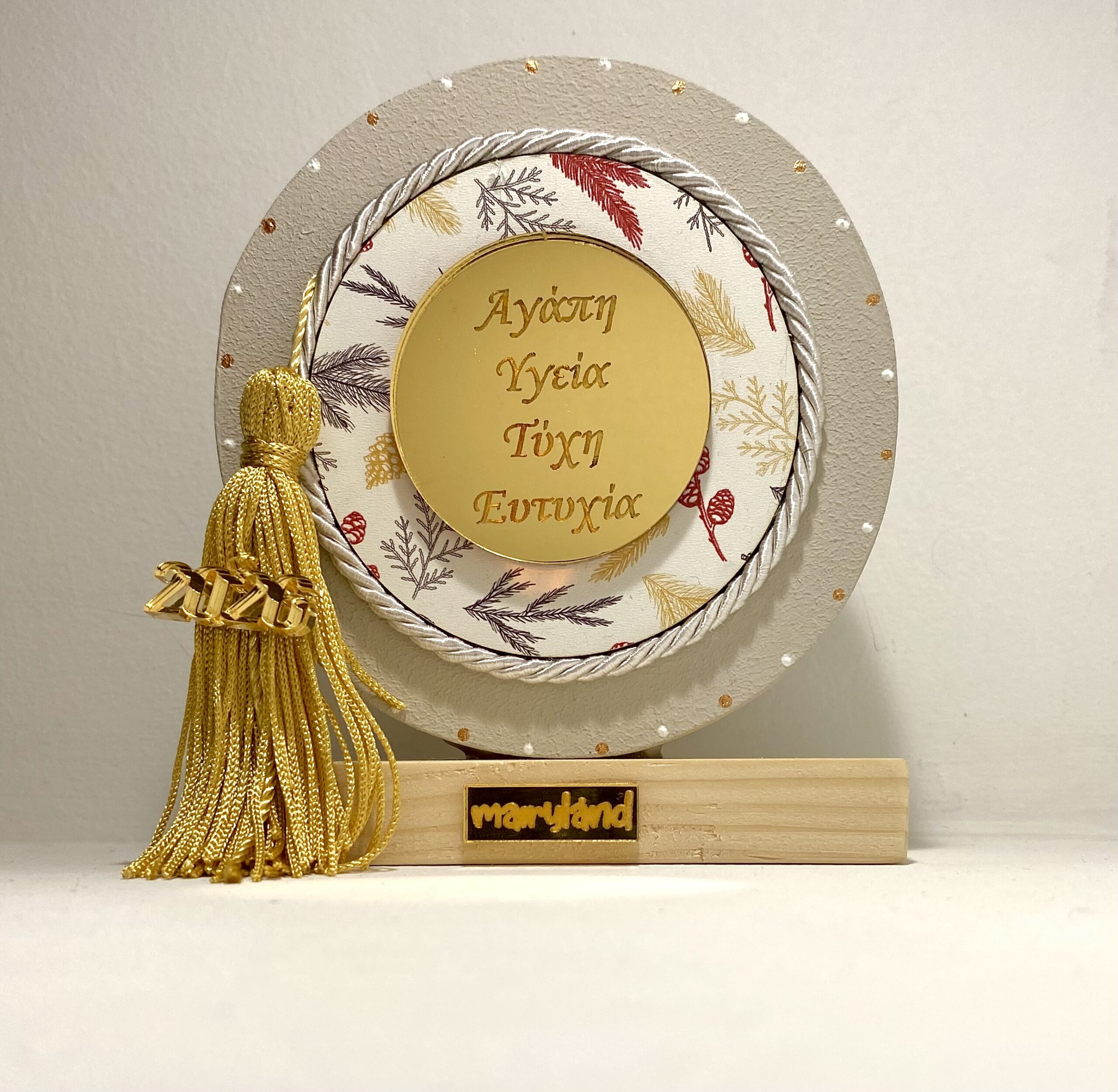 Στο κέντρο βρίσκεται χρυσός δίσκος από plexiglass, χαραγμένος με ευχές για καλή χρονιά, ενώ το υφασμάτινο μοτίβο με κλαδιά και χειμωνιάτικες πινελιές δίνει χριστουγεννιάτικη ταυτότητα στο κομμάτι. Η πολυτελής χρυσή φούντα προσθέτει λάμψη, ενώ το χρυσό στοιχείο 2026 ολοκληρώνει την εορταστική αισθητική.