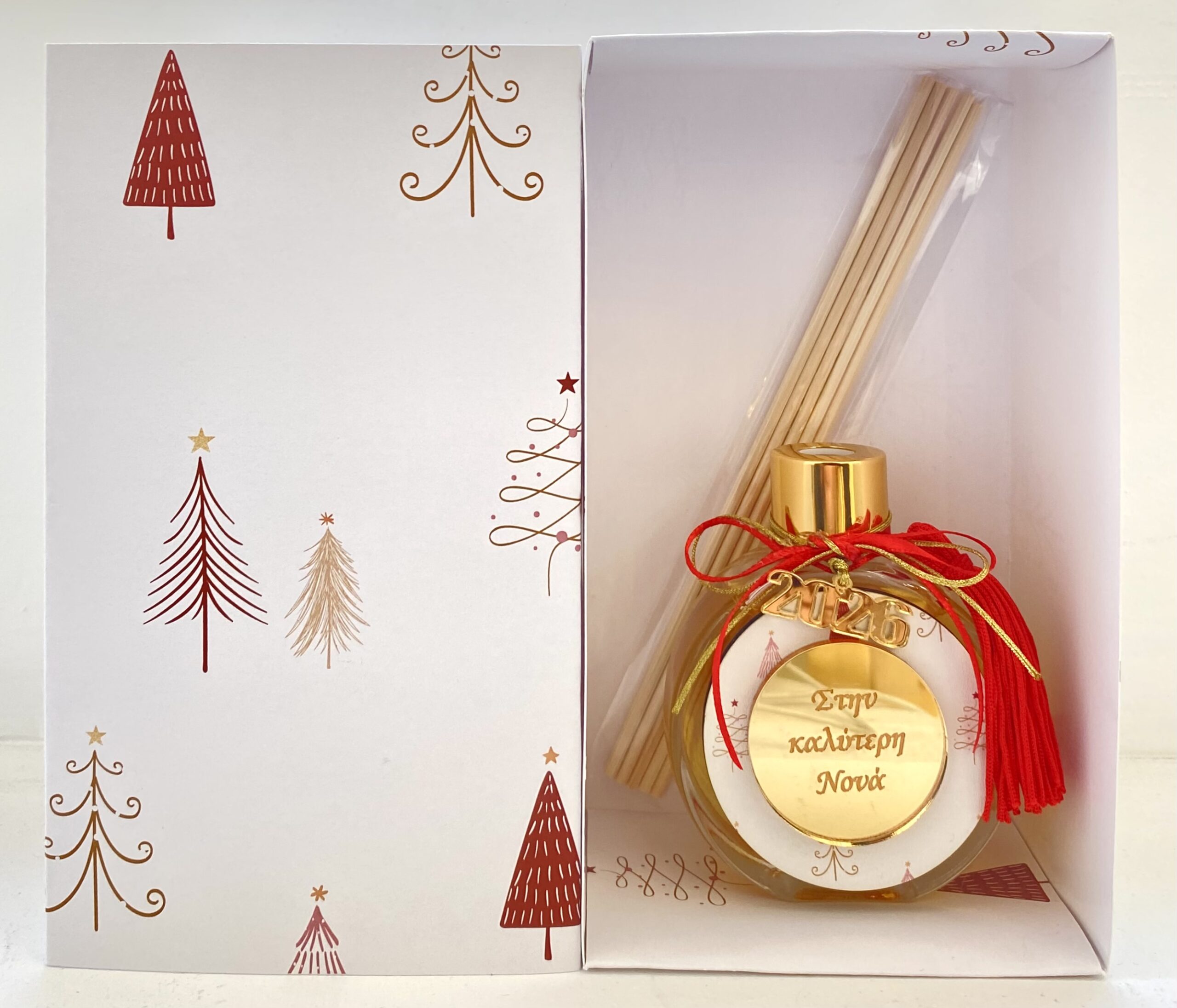 Το αρωματικό χώρου με ξυλάκια διάχυσης από το Mairyland είναι προσεκτικά διακοσμημένο με χρυσή πινακίδα ευχής, κόκκινη φουντίτσα, φιόγκο και μεταλλικό charm 2026 σε χρυσό φινίρισμα.