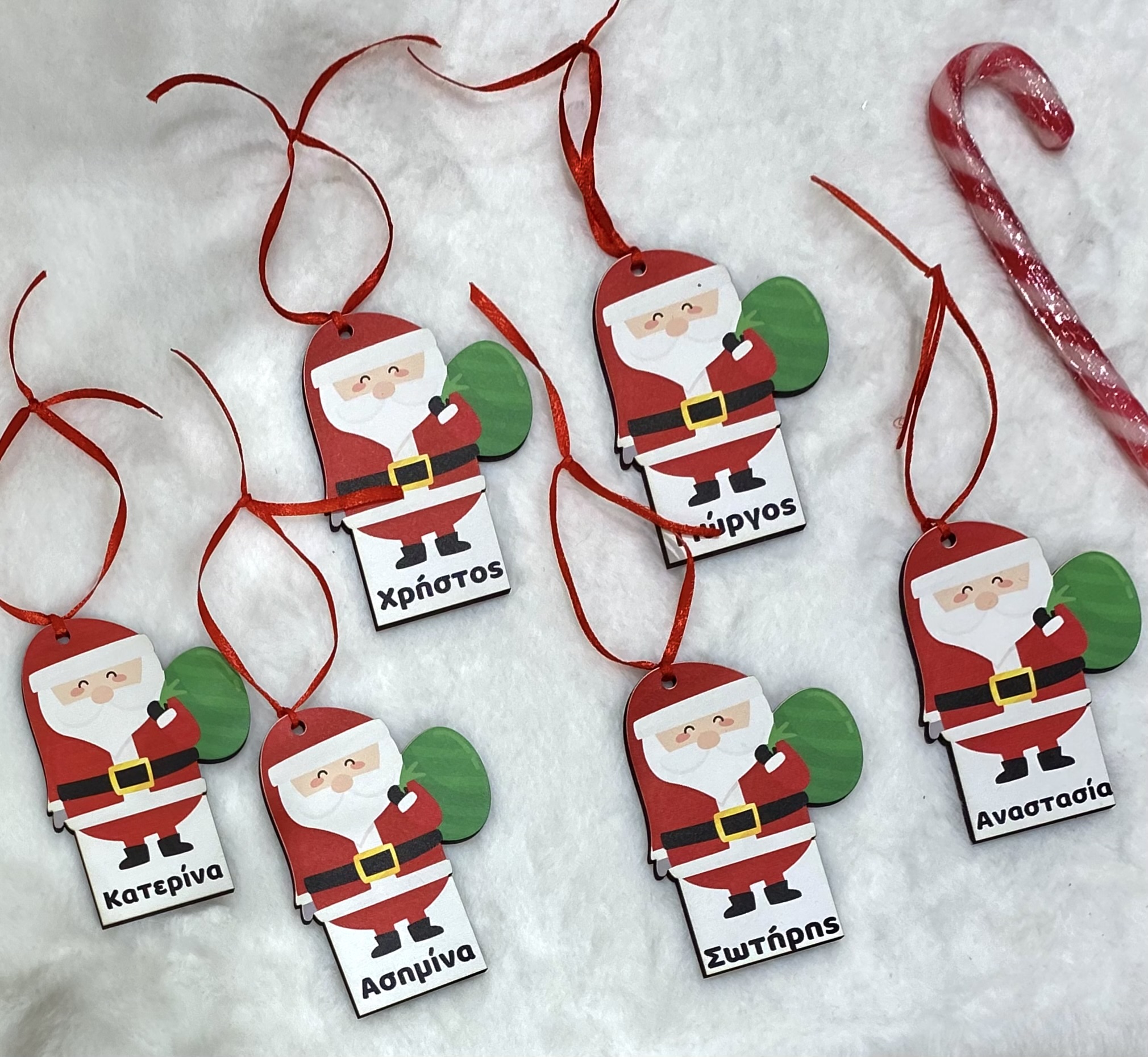 Κάθε στολίδι είναι χειροποίητο, με χαριτωμένο σχέδιο Άγιου Βασίλη, κόκκινη κορδελίτσα για κρέμασμα και το όνομα του παιδιού τυπωμένο προσεκτικά στο κάτω μέρος.