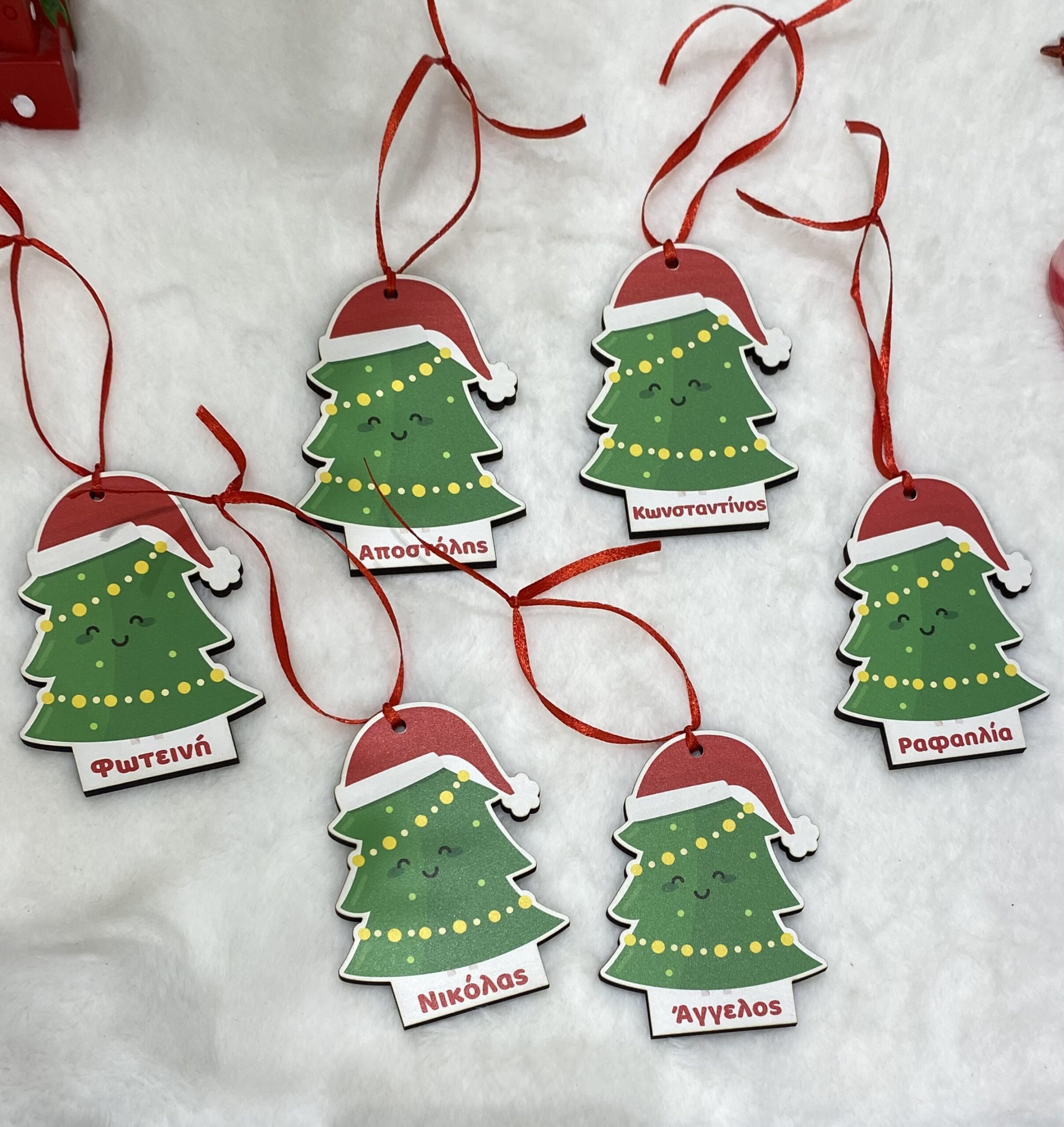 Κάθε στολίδι είναι χειροποίητο, με χαριτωμένο σχέδιο Christmas tree, κόκκινη κορδελίτσα για κρέμασμα και το όνομα του παιδιού τυπωμένο προσεκτικά στο κάτω μέρος.