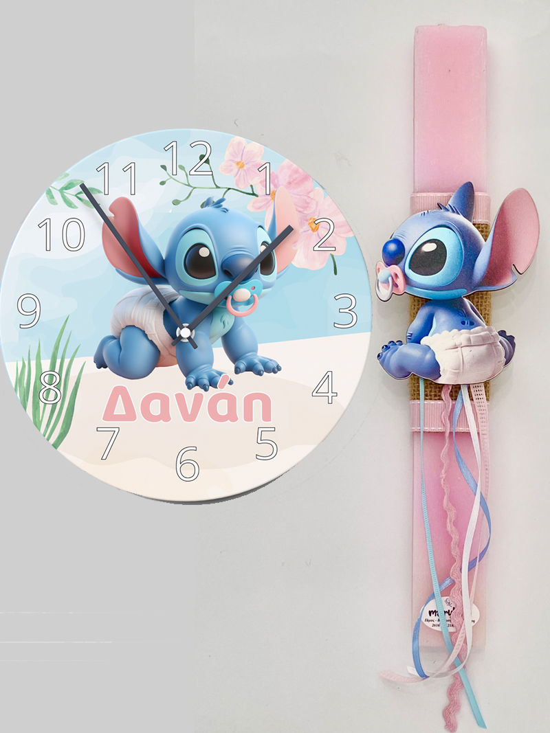 Η λαμπάδα συνοδεύεται από ένα πολύ όμορφο ρολόι τοίχου με ψηφιακή εκτύπωση Baby Stitch που μπορούμε να γράψουμε το όνομα του παιδιού.