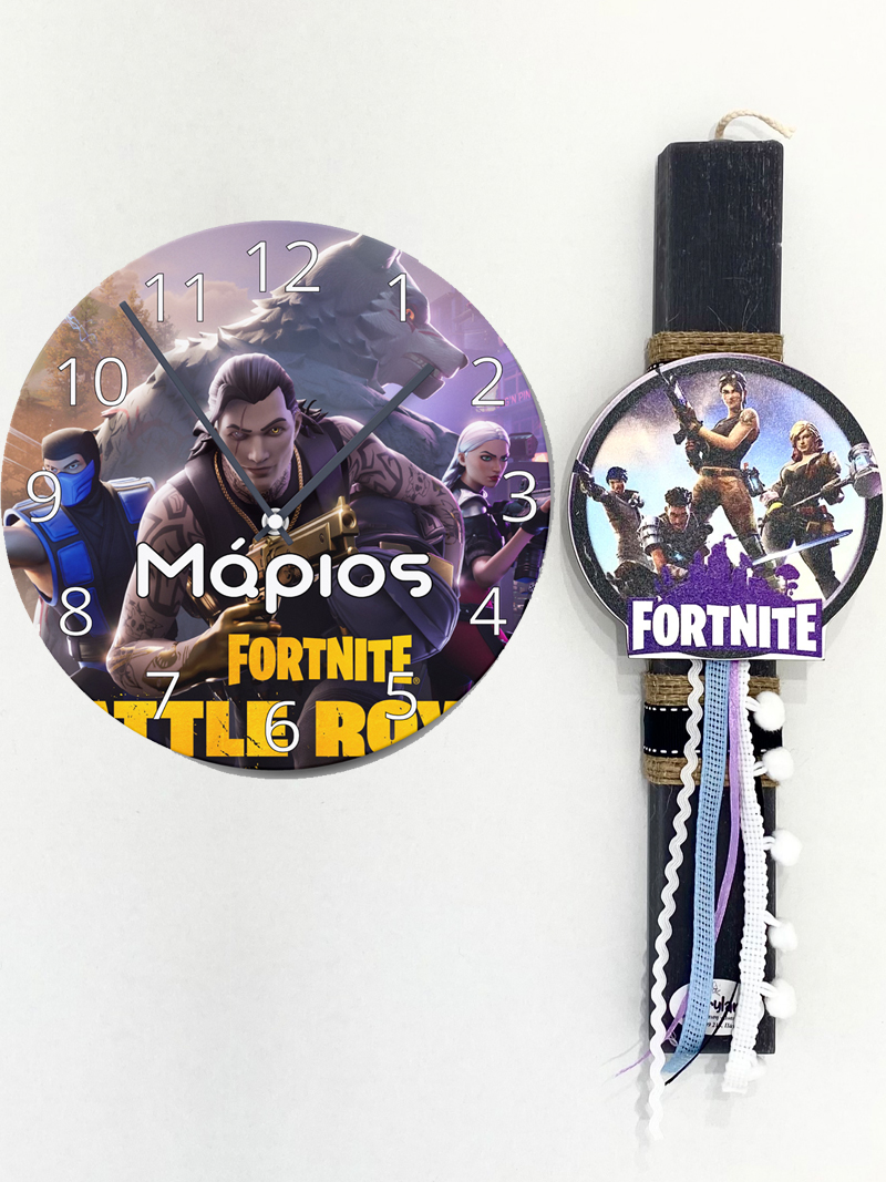 Η λαμπάδα συνοδεύεται από ένα πολύ όμορφο ρολόι τοίχου με ψηφιακή εκτύπωση Fortnite που μπορούμε να γράψουμε το όνομα του παιδιού.