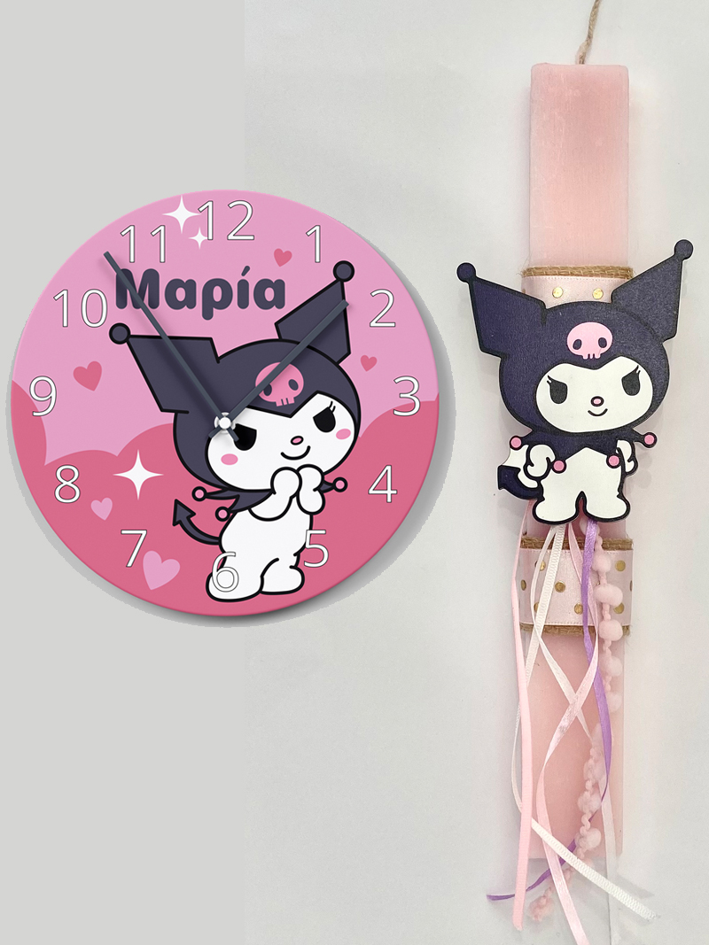 Η λαμπάδα συνοδεύεται από ένα πολύ όμορφο ρολόι τοίχου με ψηφιακή εκτύπωση Kuromi που μπορούμε να γράψουμε το όνομα του παιδιού.