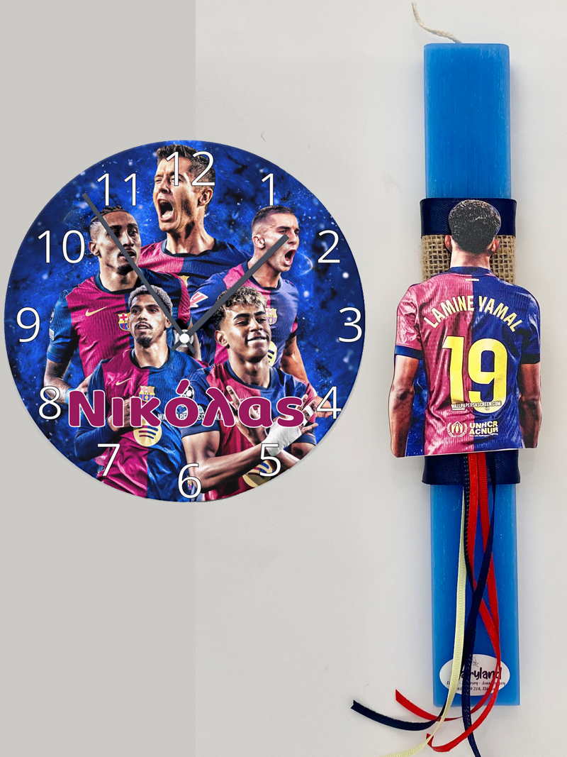 Η λαμπάδα συνοδεύεται από ένα πολύ όμορφο ρολόι τοίχου με ψηφιακή εκτύπωση Lamine Yamal  που μπορούμε να γράψουμε το όνομα του παιδιού.