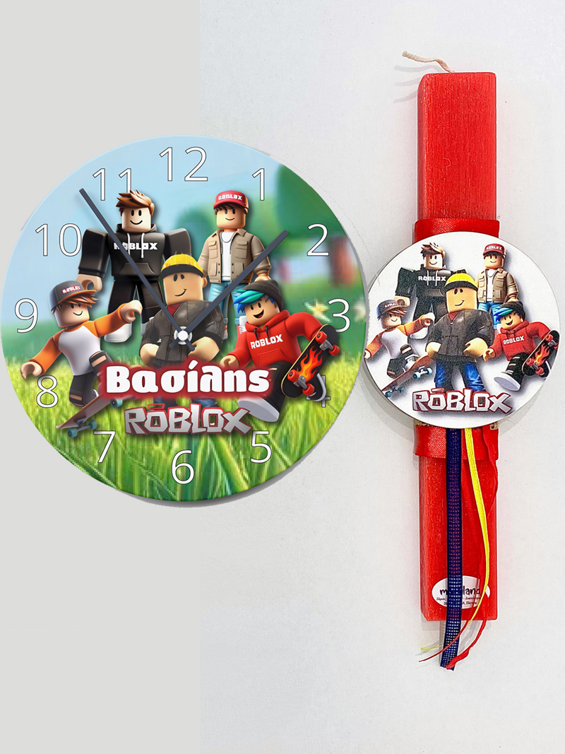 Η λαμπάδα συνοδεύεται από ένα πολύ όμορφο ρολόι τοίχου με ψηφιακή εκτύπωση Roblox  που μπορούμε να γράψουμε το όνομα του παιδιού.
