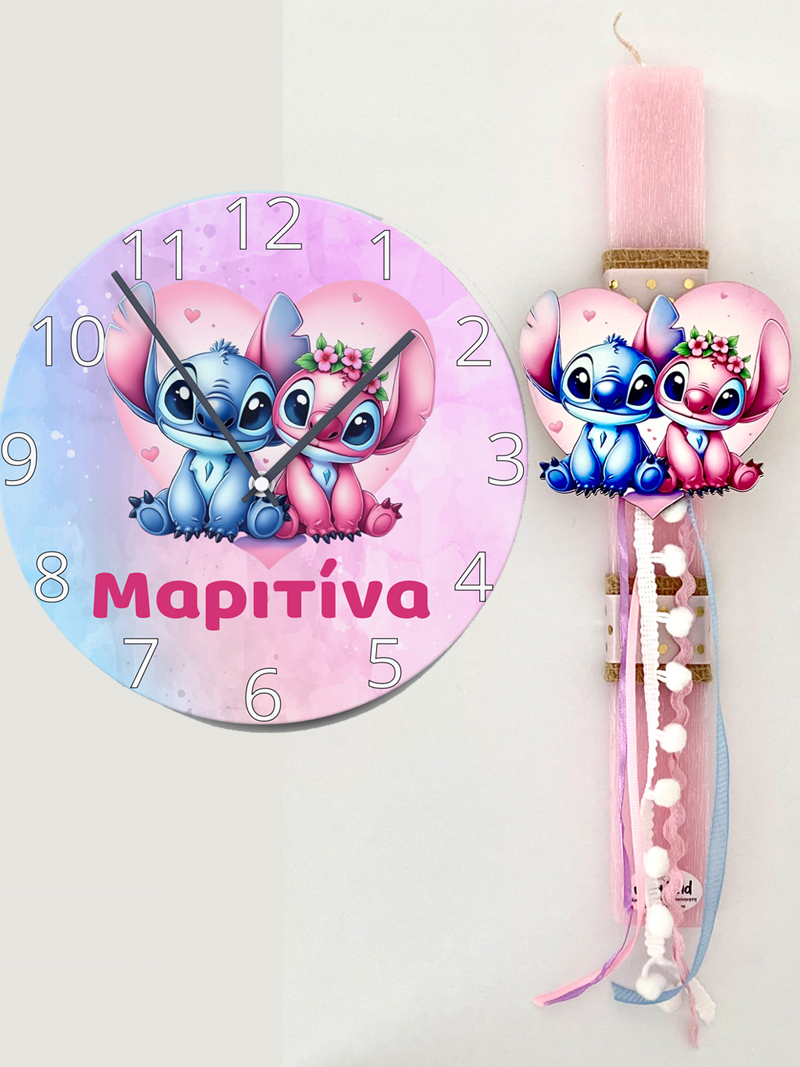 Η λαμπάδα συνοδεύεται από ένα πολύ όμορφο ρολόι τοίχου με ψηφιακή εκτύπωση Stitch and Angel που μπορούμε να γράψουμε το όνομα του παιδιού.