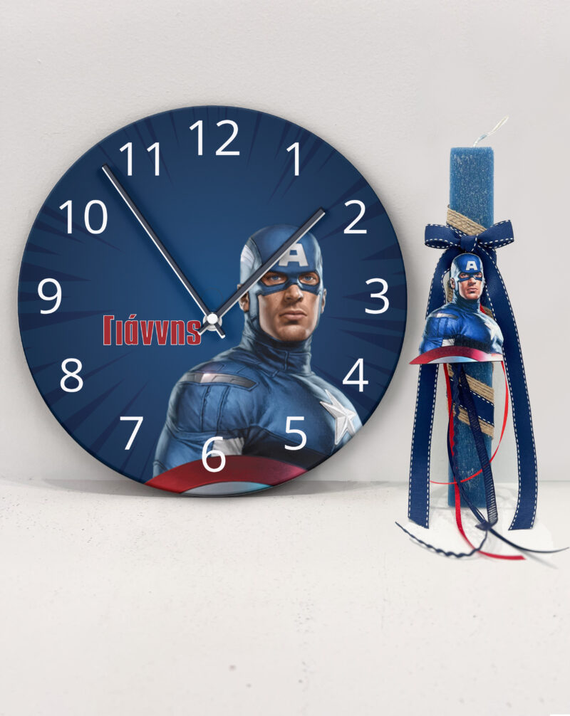 Η λαμπάδα συνοδεύεται από ένα πολύ όμορφο ρολόι τοίχου με ψηφιακή εκτύπωση Captain America που μπορούμε να γράψουμε το όνομα του παιδιού.
