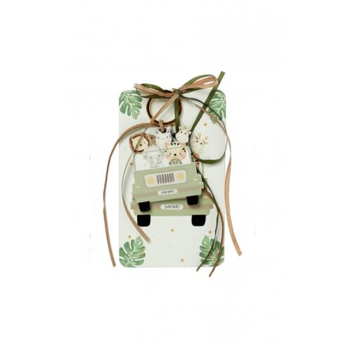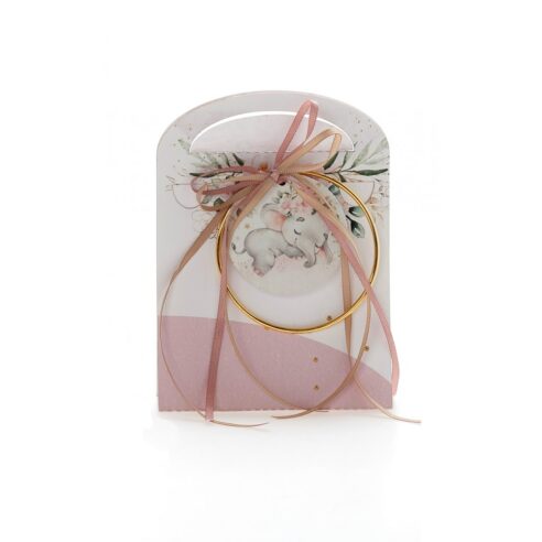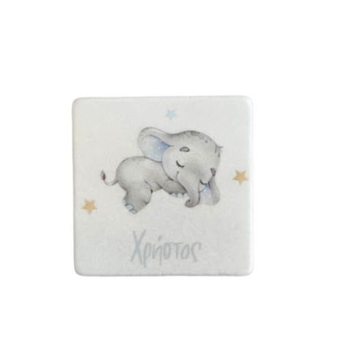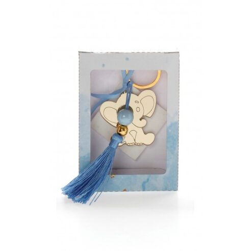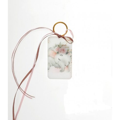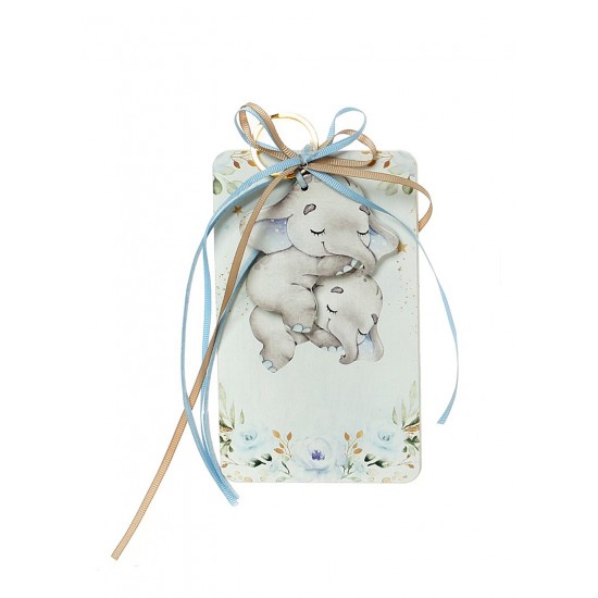 Μπομπονιέρα με ξύλινη πλάτη και μπρελόκ με σχέδιο Ελεφαντάκι