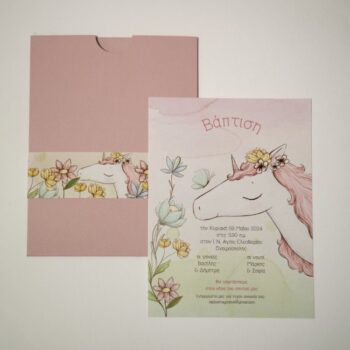 Προσκλητήριο βάπτισης MyMastoras σε θέμα Unicorn, σε φάκελο ορθογώνιο μύτη CUBEBA χρώματος σαπιο μήλο, με εξωτερικό στρογγυλό καρτελάκι σε ασορτί σχέδιο και κάρτα old mil σε ροζ αποχρώσεις.