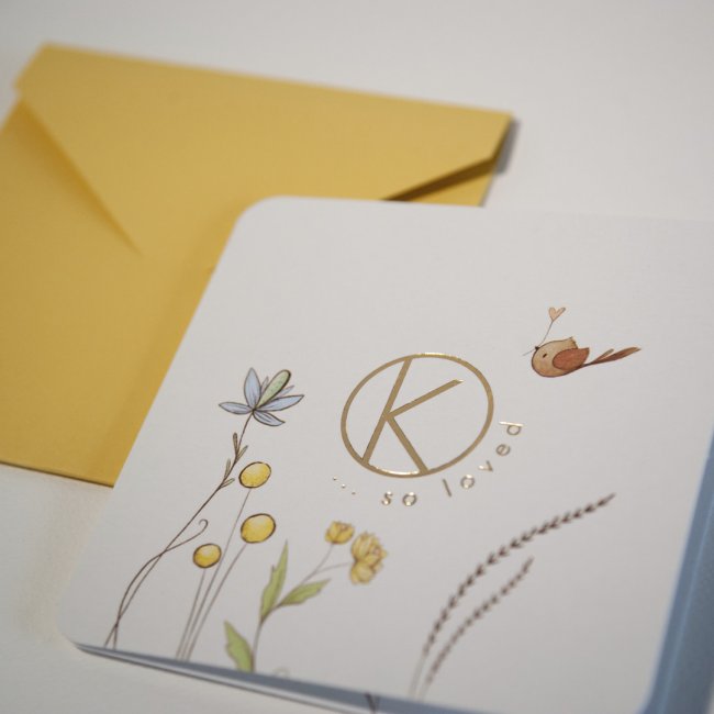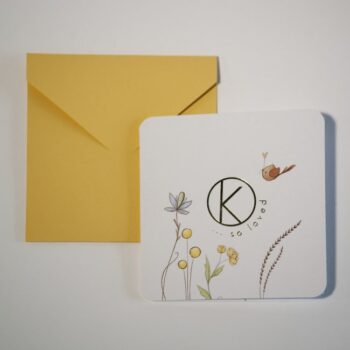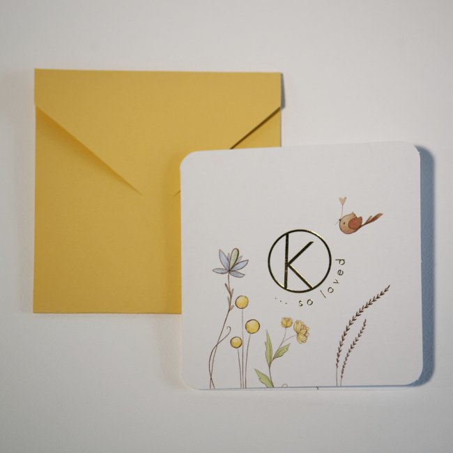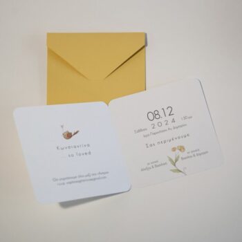 Προσκλητήριο βάπτισης MyMastoras με θέμα πουλάκι, σε φάκελο σε κίτρινο χρώμα τετράγωνο μύτη Natural Evolution, με εκτύπωση 2 όψεων και κάρτα old mil σε γήινες αποχρώσεις.