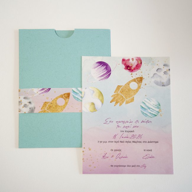 Προσκλητήριο βάπτισης MyMastoras με θέμα πύραυλος, σε φάκελο όρθιο συρταρωτό βεραμάν, με εξωτερικό στρογγυλό καρτελάκι σε ασορτί σχέδιο με την κάρτα και κάρτα old mil σε λιλά με βεραμάν αποχρώσεις.