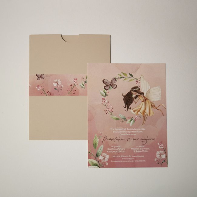 Προσκλητήριο βάπτισης MyMastoras σε θέμα νεράιδα και λουλούδια, σε φάκελο όρθιο συρταρωτό Cubeba, με εξωτερικό καρτελάκι ασορτί με την κάρτα γύρω απο τον φάκελο και κάρτα old mil σε πολύχρωμες αποχρώσεις.