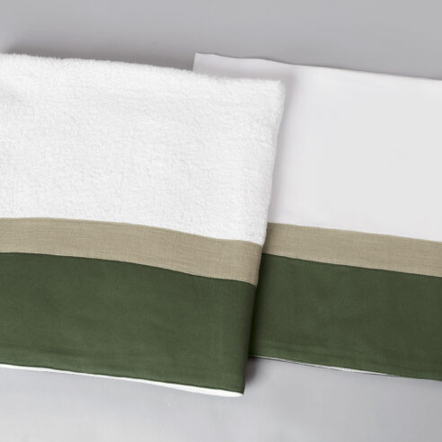Άσπρο σεντόνι με μια μεγάλη φάσα σε άσπρο χρώμα και μια μικρή γκρι κορδέλα, διαστάσεων 1,40m x 1,00m. Το σεντόνι διατίθεται και σε εκρού χρώμα, η φάσα σε μεγάλη ποικιλία χρωμάτων.