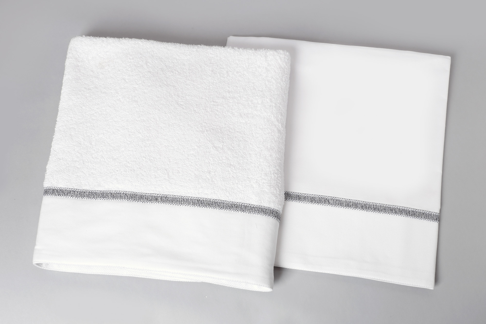 Άσπρη πετσέτα με μια μεγάλη φάσα σε άσπρο χρώμα και μια μικρή γκρι κορδέλα, διαστάσεων 1,40m x 0,80m. Η πετσέτα διατίθεται και σε εκρού χρώμα, η φάσα σε μεγάλη ποικιλία χρωμάτων.