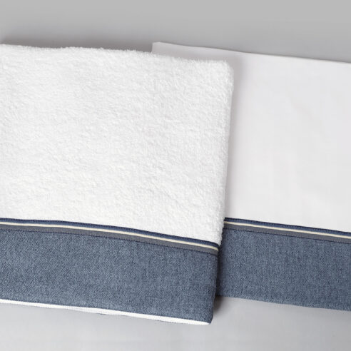 Άσπρη πετσέτα με μια μεγάλη φάσα σε κόκκινο χρώμα και μια μικρή σε μπλε, διαστάσεων 1,40m x 0,80m. Η πετσέτα διατίθεται και σε εκρού χρώμα, οι φάσες σε μεγάλη ποικιλία χρωμάτων.