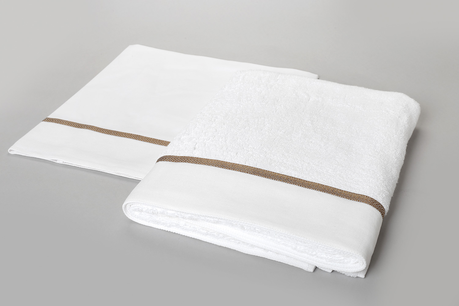 Άσπρη πετσέτα με μια μεγάλη φάσα σε εκρού χρώμα και μια ραμμένη κορδέλα στο επάνω μέρος, διαστάσεων 1,40m x 0,80m. Η πετσέτα διατίθεται και σε εκρού χρώμα, η φάσα και η κορδέλα σε μεγάλη ποικιλία χρωμάτων. Άσπρη πετσέτα διαστάσεων 0,50m x 0,30m. Η πετσέτα διατίθεται και σε εκρού χρώμα.
