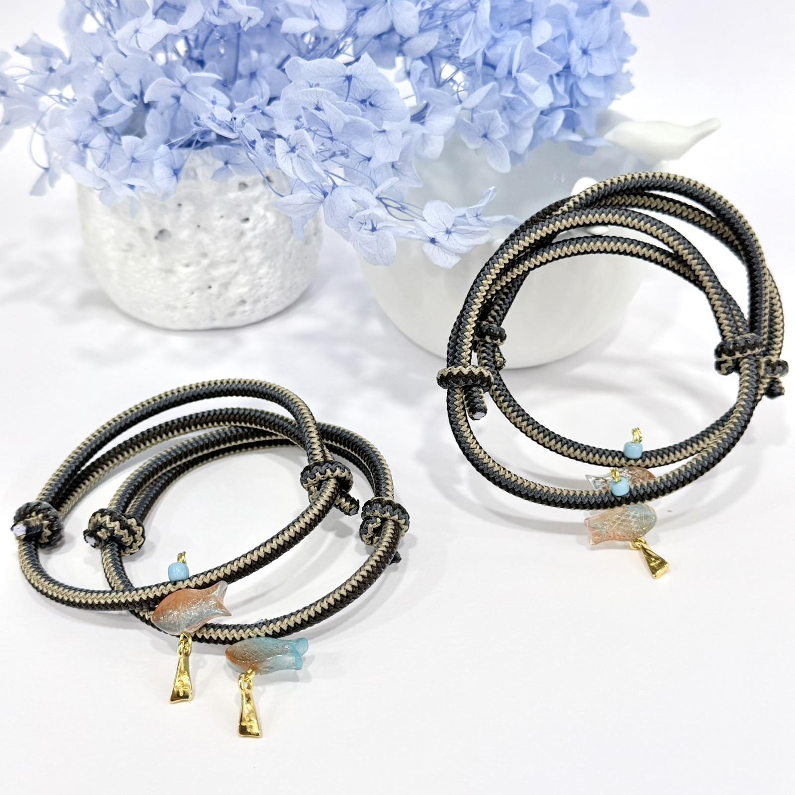 Βραχιόλι αυξομείωσης με ελαστικό δίχρωμο κορδόνι ,γυάλινο ψαράκι και σταυρό 24Κ