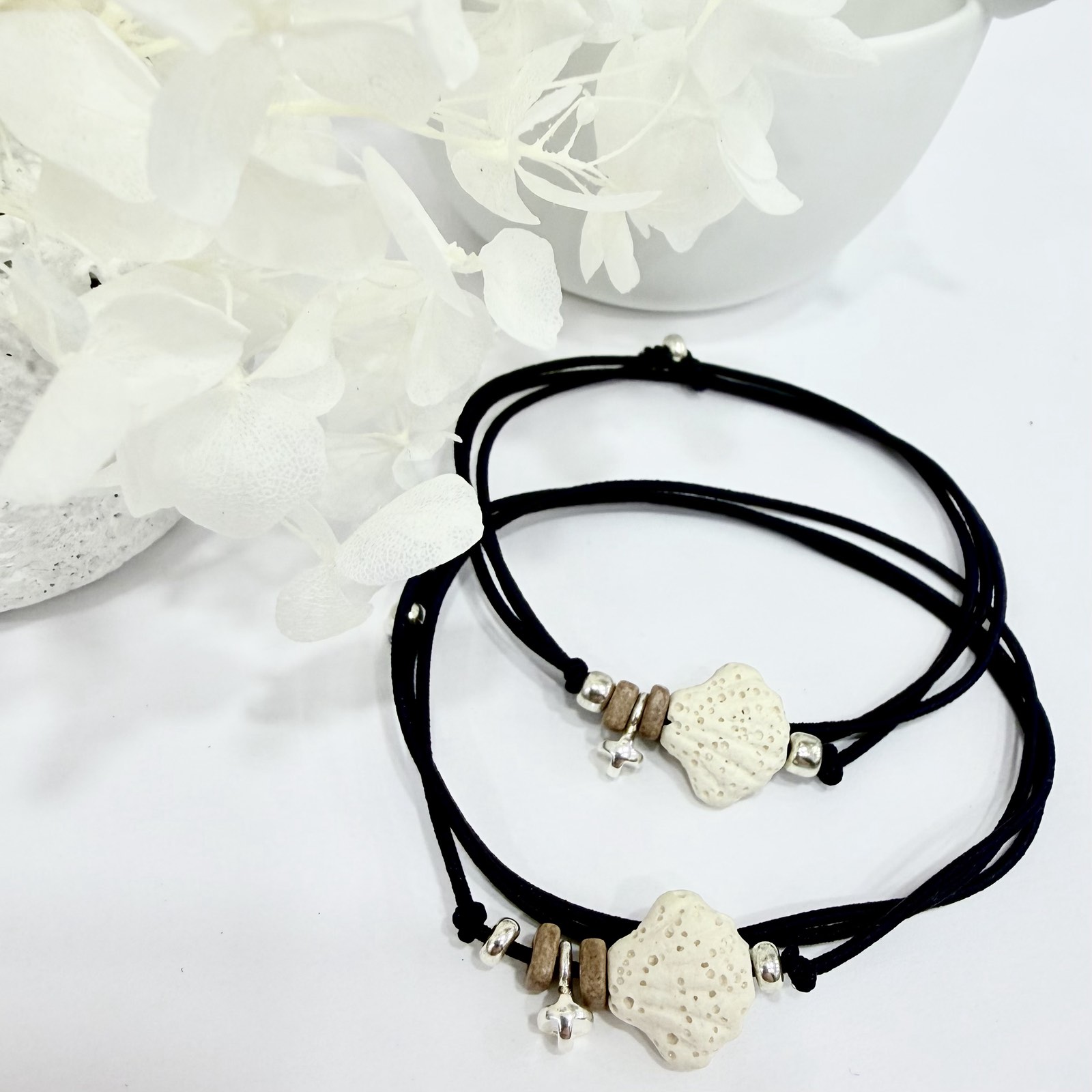Βραχιόλι με ελαστικό κορδόνι ,λάβα κοχύλι και επάργυρο σταυρό