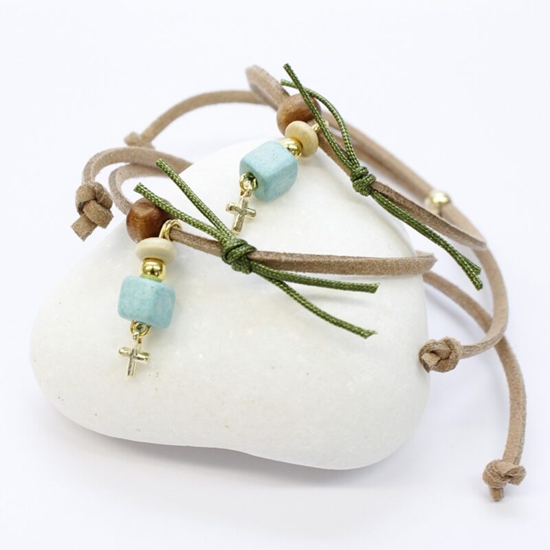 Μαρτυρικά Βραχιόλι σουέτ με κεραμεική, ξύλινη χάντρα και επίχρυσο σταυρό 23156
