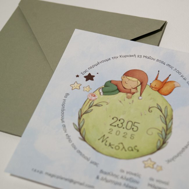 Προσκλητήριο βάπτισης MyMastoras με θέμα Μικρός Πρίγκιπας, σε φάκελο τετράγωνο συρταρωτό remake, με εξωτερική τρέσα σε ασορτί σχέδιο και κάρτα old mil σε σιέλ αποχρώσεις.