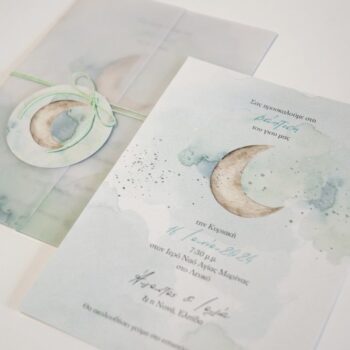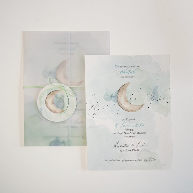 Προσκλητήριο βάπτισης MyMastoras με θέμα φεγγάρι, σε φάκελο ρυζόχαρτο παράθυρο, με καρτελάκι σε ασορτί σχέδιο και κάρτα old mil σε σιελ αποχρώσεις.
