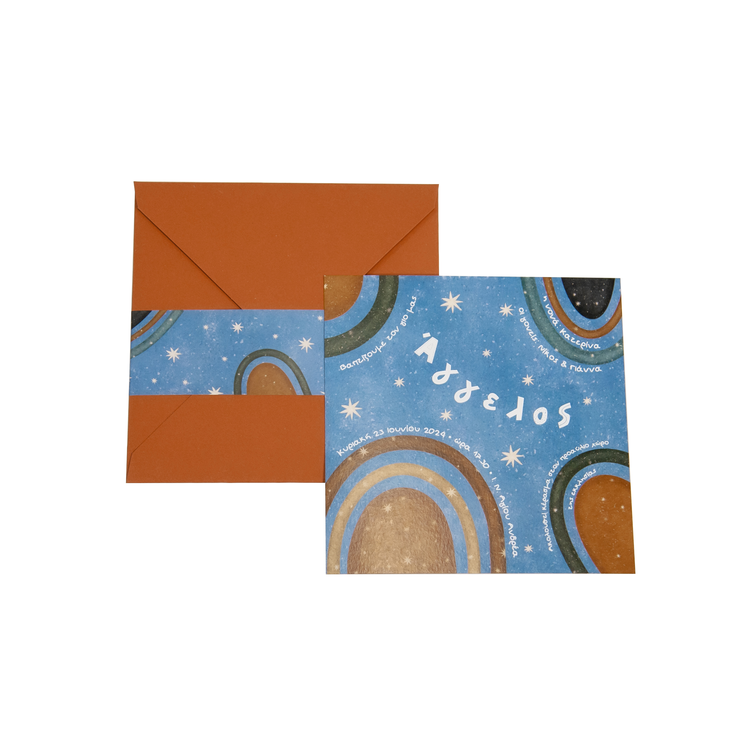 Προσκλητήριο βάπτισης MyMastoras με θέμα Διάστημα, σε τετράγωνο φάκελο με μύτη και τρέσσα Tera rosa 250gr και κάρτα xperia 320gr. σε πορτοκαλί-μπλε αποχρώσεις. Η τιμή αφορά το σετ προσκλητηρίου που απεικονίζεται στη φωτογραφία.