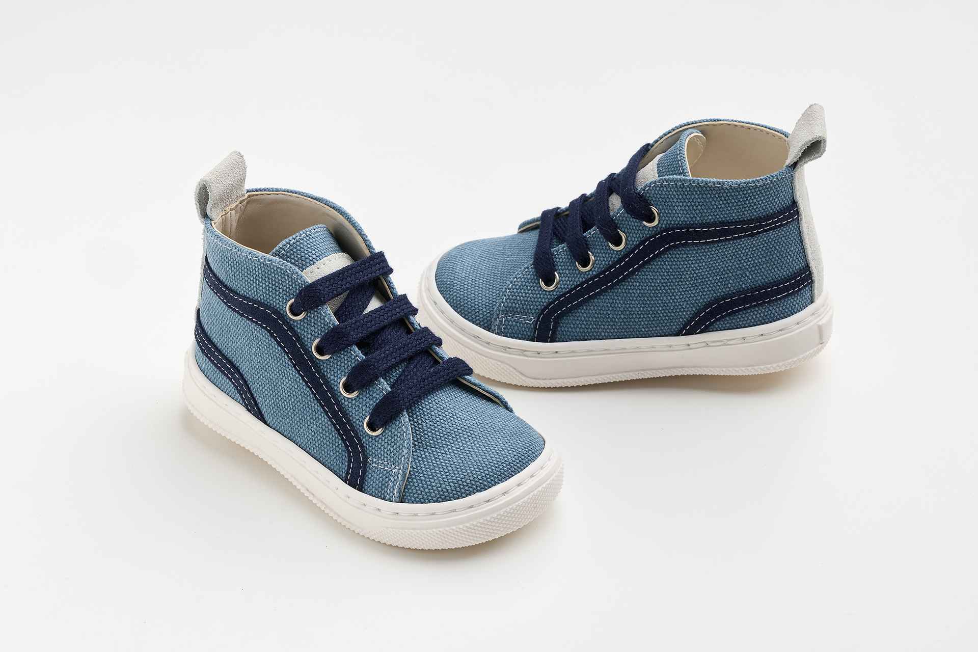 μποτάκι περπατήματος σε μπλε ύφασμα και λεπτομέρεια από μπεζ και λευκό καστόρ δέρμα