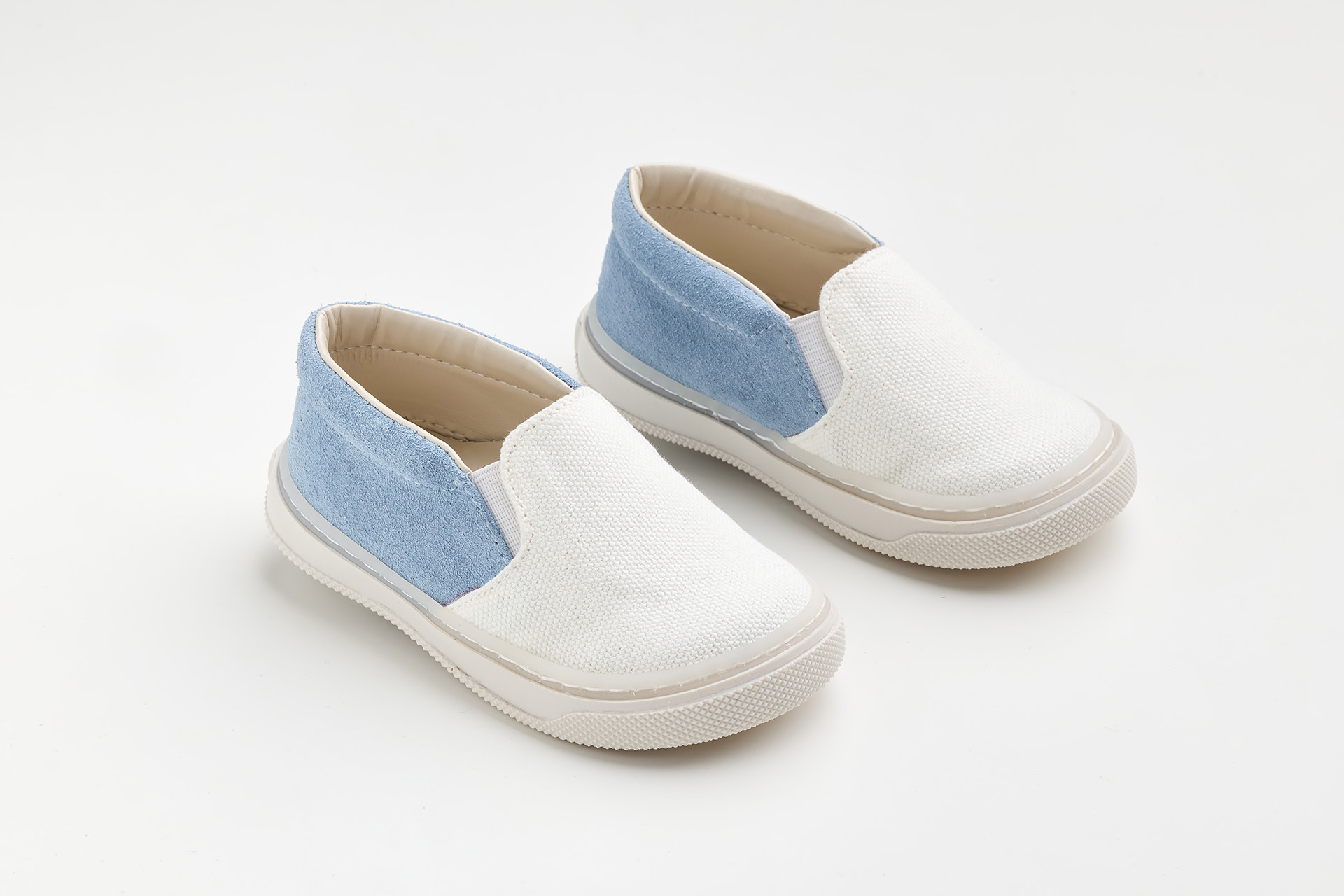 εσπαντρίγια περπατήματος, σε λευκό ύφασμα και γαλάζιο καστόρ δέρμα