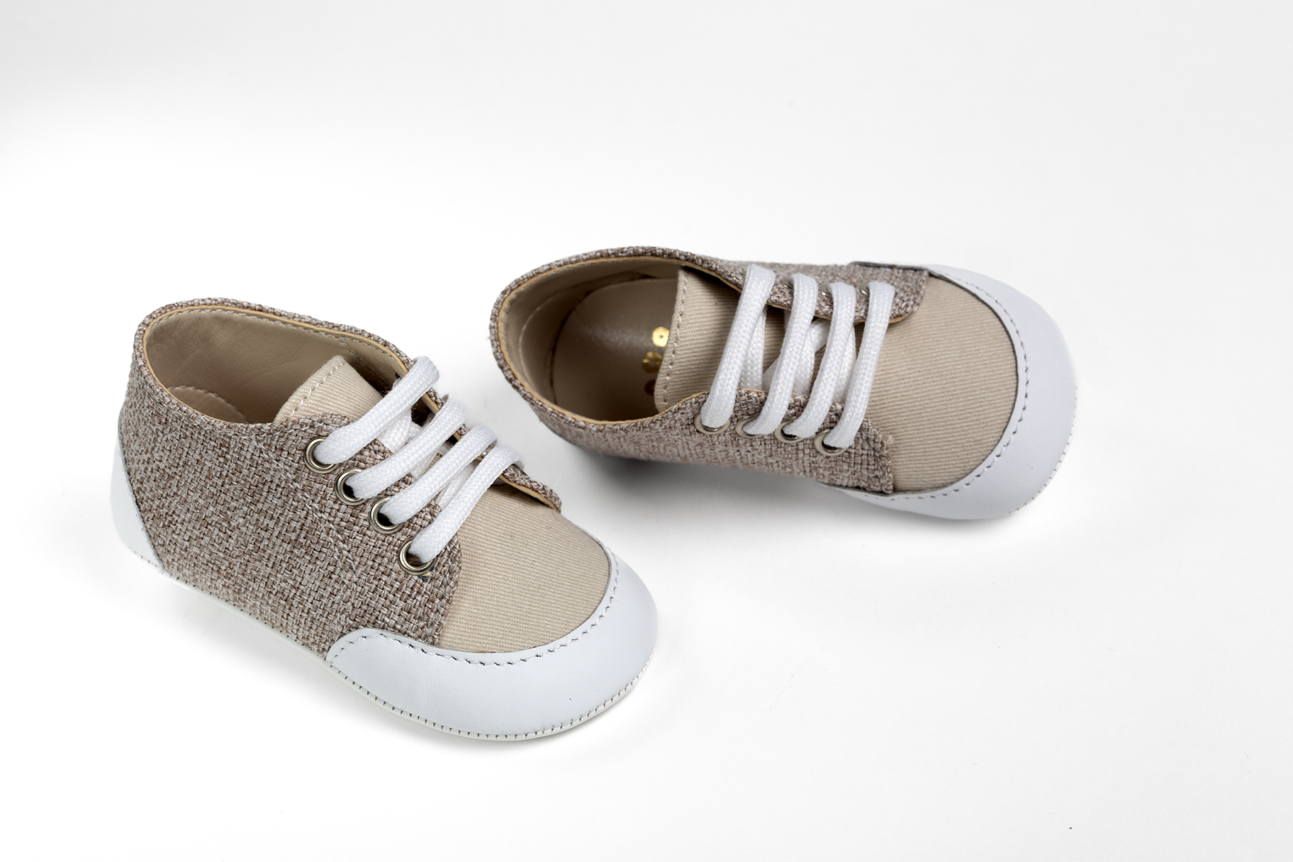 A402Ε Παπουτσάκι αγκαλιάς χαμηλό, από εκρού και μπεζ ύφασμα, με δερμάτινη λεπτομέρεια.