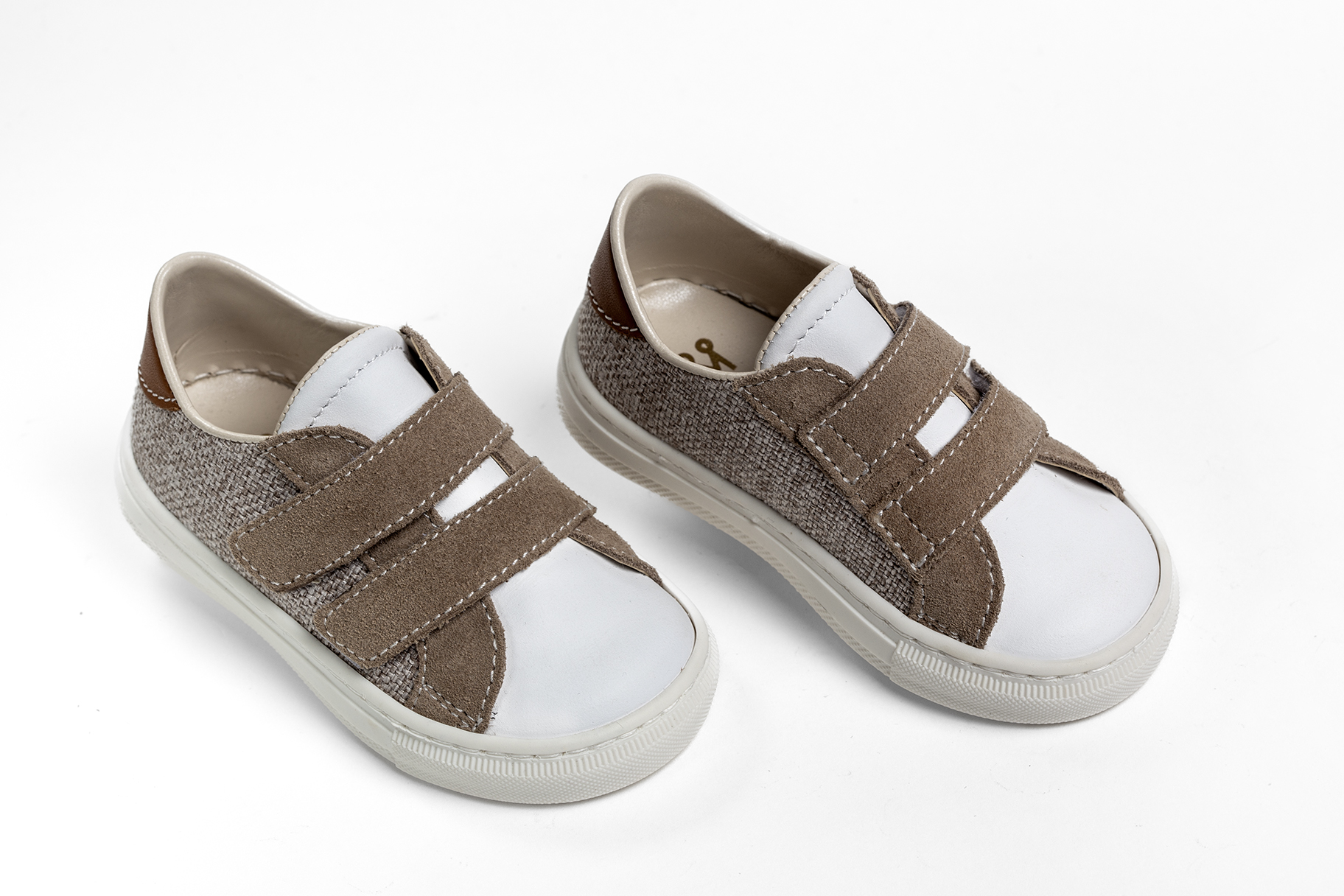 Α428Ε Παπούτσι περπατήματος sneaker από μπεζ ύφασμα με μοτίβο, λευκό δέρμα και πούρο καστόρ, ταμπά λεπτομέρεια και κλείσιμο με δυο velcro. Νουμ. 19-27