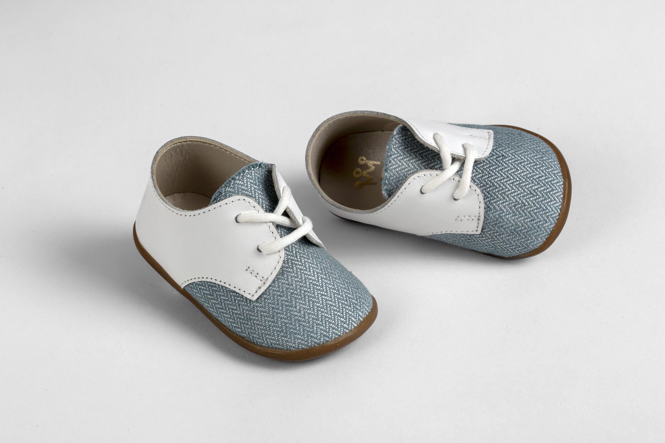 Παπουτσάκι για τα πρώτα βήματα σε λευκό δέρμα και πετρόλ ύφασμα