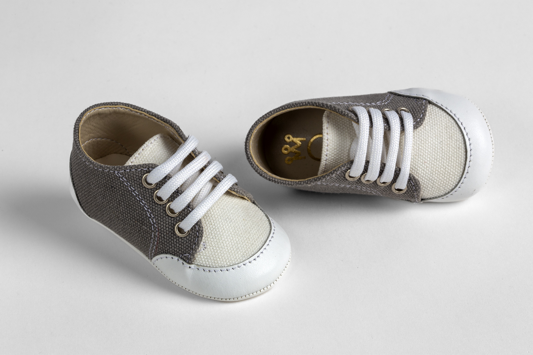 Παπουτσάκι αγκαλιάς σε λευκό δέρμα, γκρι και λευκό ύφασμα