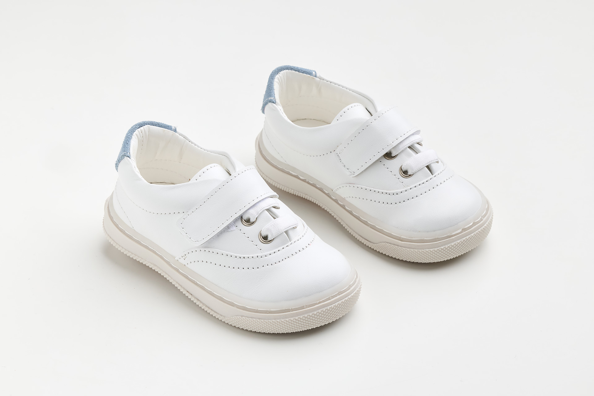 παπουτσάκι περπατήματος σε λευκό λείο δέρμα, γαλάζιο καστόρ δέρμα και κλείσιμο με ελαστικό κορδόνι και Velcro