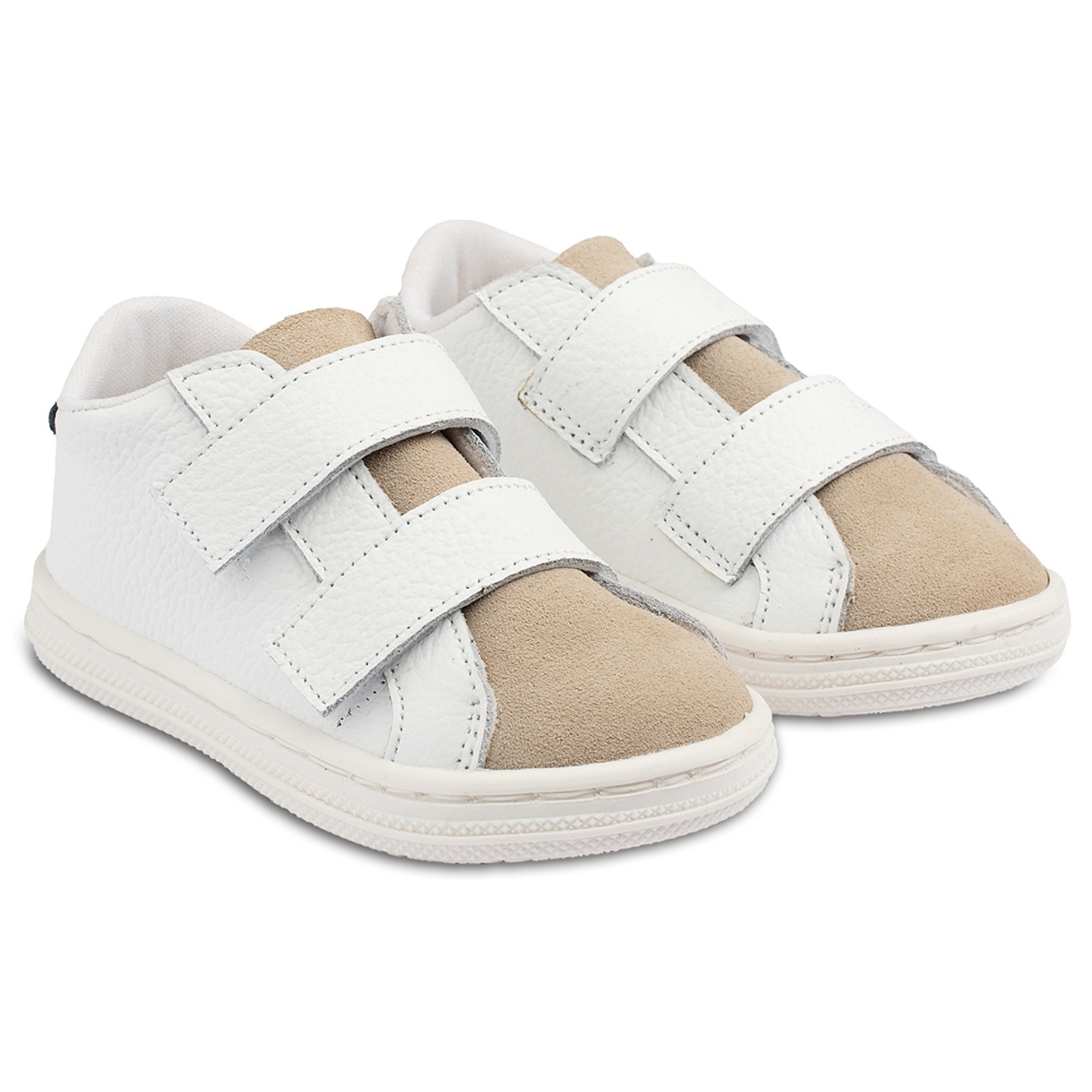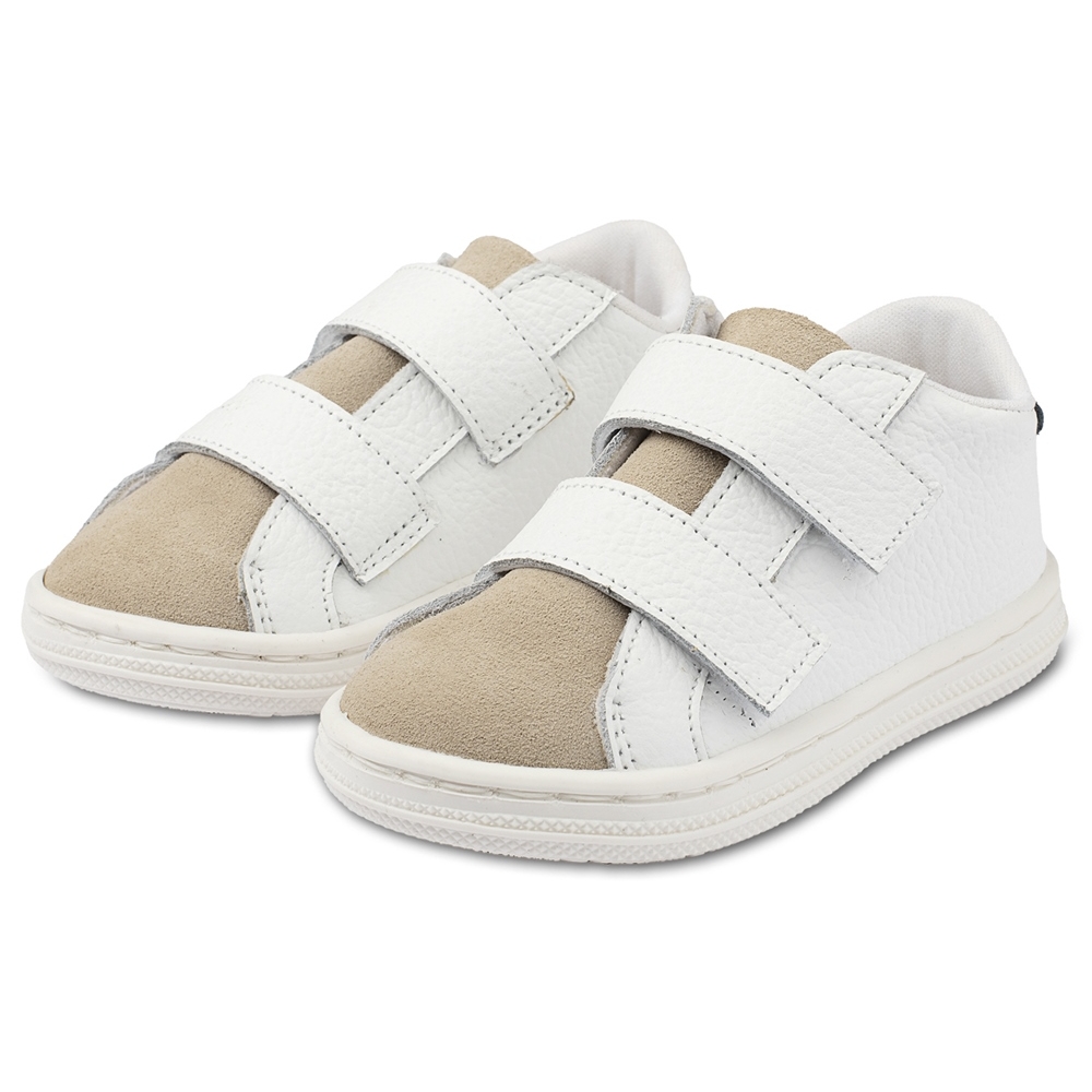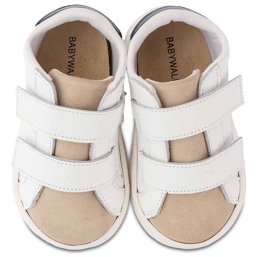 Δερμάτινο τρίχρωμο σνίκερ με χρατς, σε λευκό μπεζ μπλε χρώμα (υπάρχει λίγο μπλε χρώμα στο πίσω μέρος του παπουτσιού).