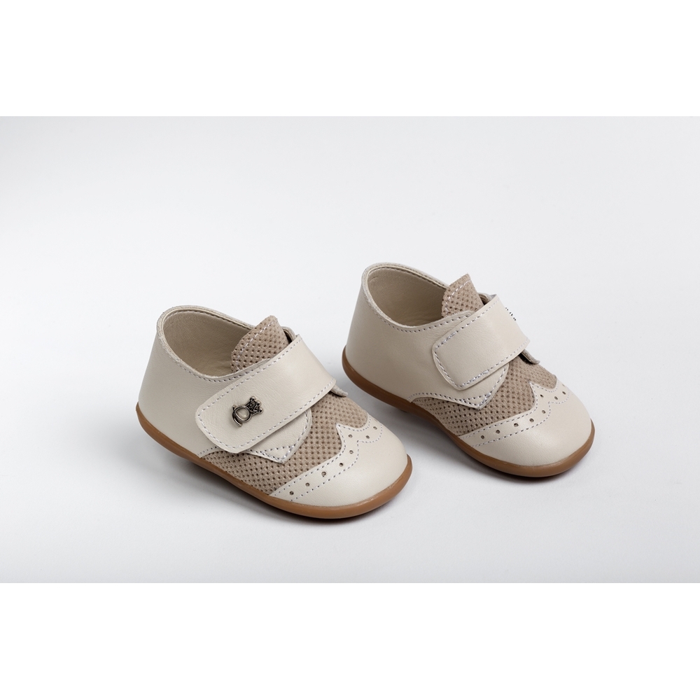 Παπουτσάκι χαμηλό για τα πρώτα βήματα από εκρού και μπεζ δέρμα, κλείσιμο με Velcro.