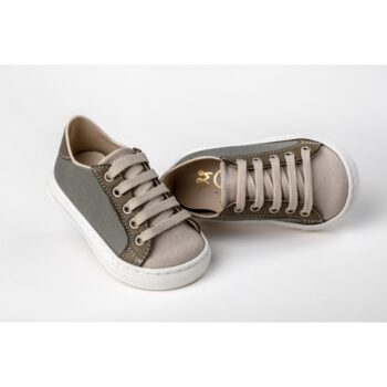 Sneaker περπατήματος δετό από λαδί δέρμα και υφάσματα σε συνδυασμό χρωμάτων μπεζ λαδί.