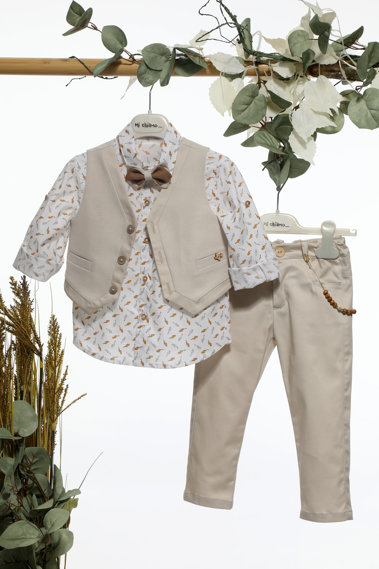 Αποτελείται από μπεζ παντελόνι, λευκό πουκάμισο με σχεδιάκια, μπεζ γιλέκο, παπιγιόν και ψάθινο καπέλο καβουράκι!