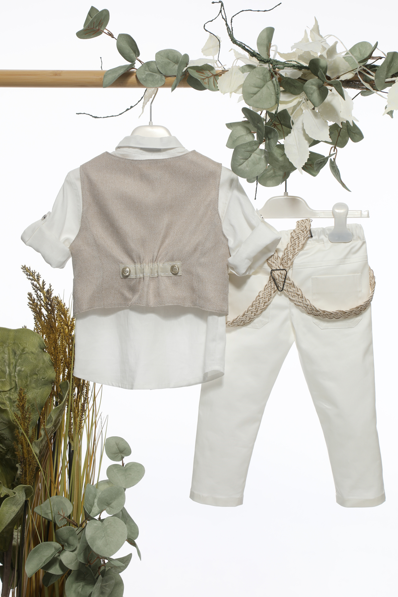 Αποτελείται από εκρού παντελόνι, λευκό πουκάμισο, μπεζ γιλέκο, τιράντες, παπιγιόν και ψάθινο καπέλο καβουράκι!