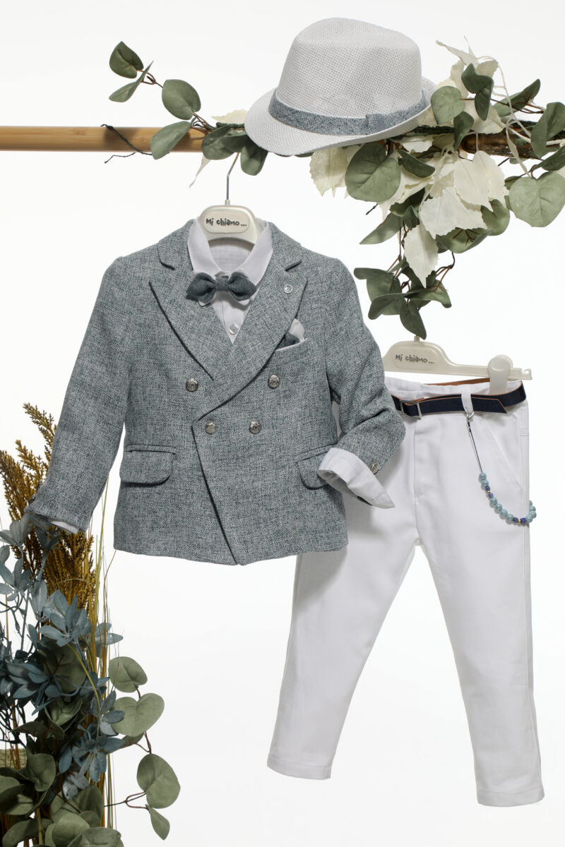 Αποτελείται από λευκό παντελόνι, λευκό πουκάμισο, ραφ γκρι χιονέ χρώμα σακάκι, ζώνη, παπιγιόν και ψάθινο καπέλο καβουράκι!