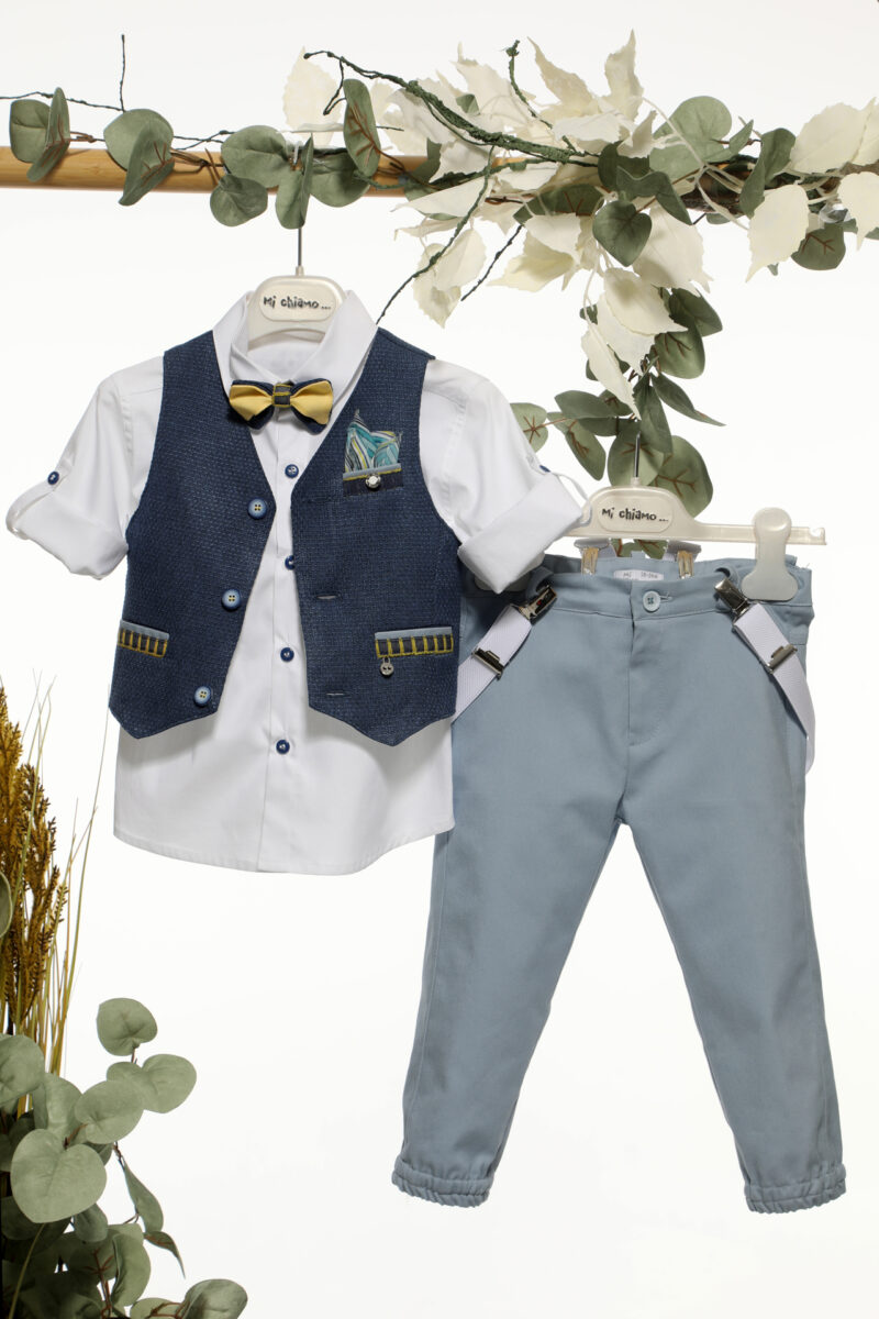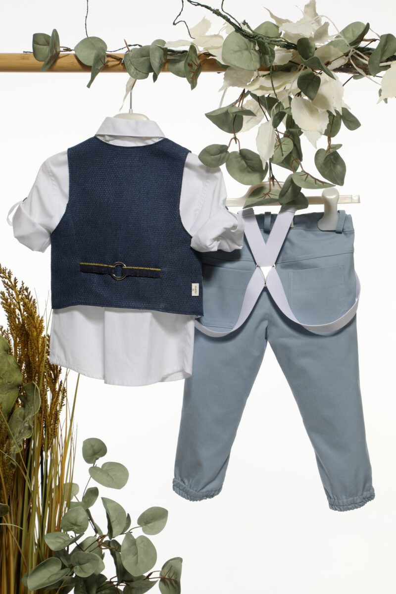 Αποτελείται από σιελ παντελόνι, λευκό πουκάμισο, μπλε γιλέκο, τιράντες, παπιγιόν και ψάθινο καπέλο καβουράκι!