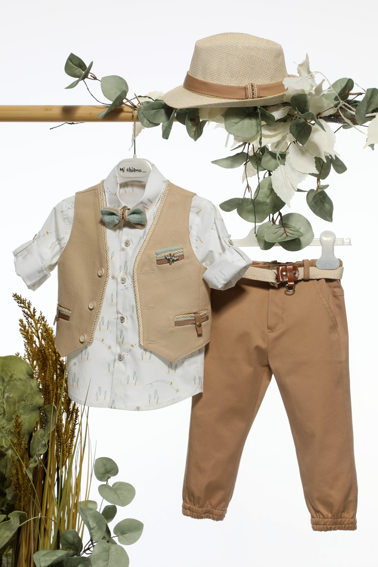 Αποτελείται από καφέ παντελόνι, λευκό πουκάμισο, μπεζ γιλέκο, ζώνη, παπιγιόν και ψάθινο καπέλο καβουράκι!