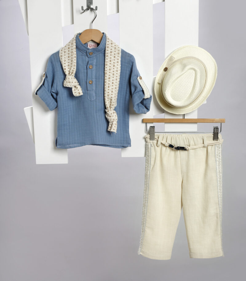 Το σύνολο συνοδεύεται με φουλάρι και ψάθινο εκρού καβουράκι με φάσα από το ύφασμα του παντελονιού.