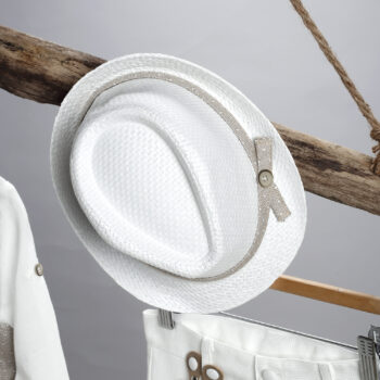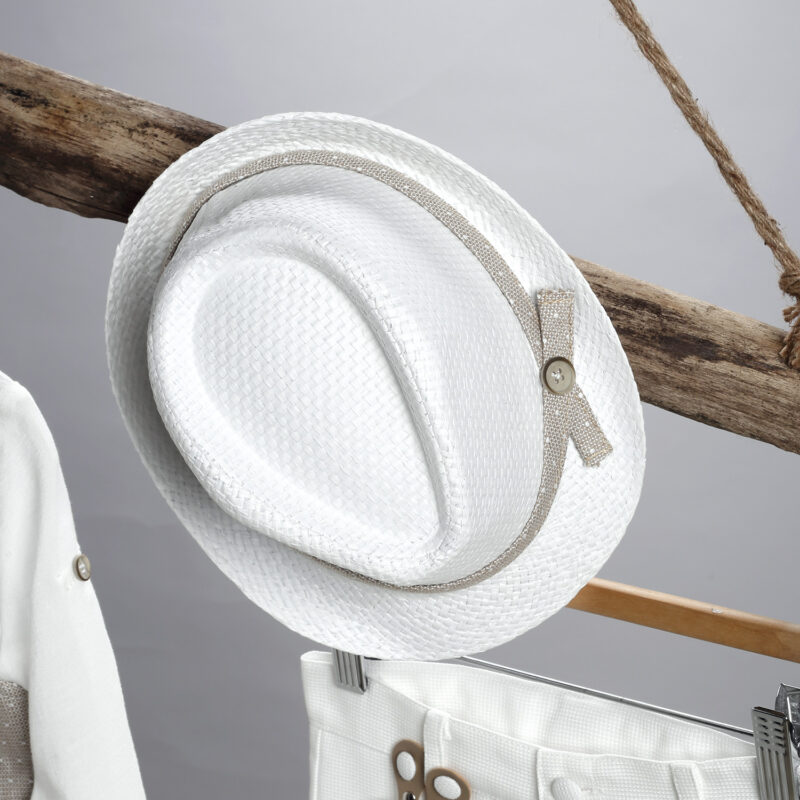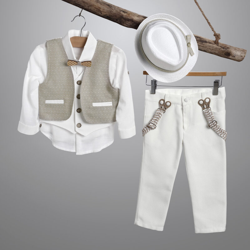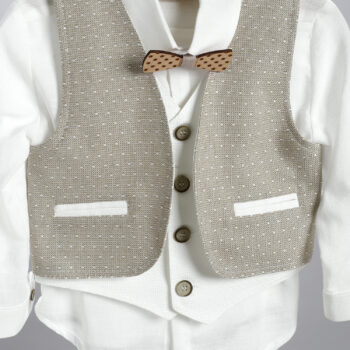 Το σύνολο συνοδεύεται με ξύλινο πουά παπιόν και ψάθινο άσπρο καβουράκι με κορδέλα από το ύφασμα του γιλέκου.