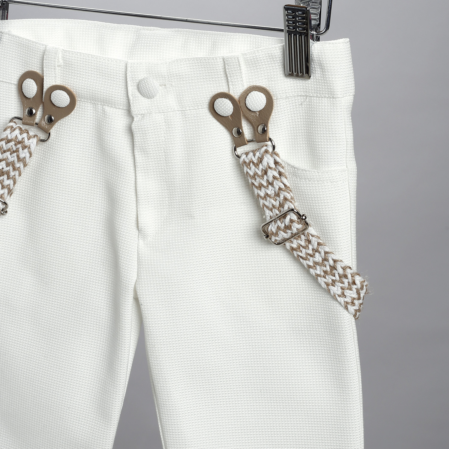 Παντελόνι ψάθα σε εκρού χρώμα. Εσωτερικά υπάρχει λάστιχο με κουμπότρυπα για τη ρύθμιση της μέσης. Διατίθεται επίσης σε μπεζ, βεραμάν, γκρι και ραφ χρώμα. Συνοδεύεται από σταθερές τιράντες.