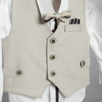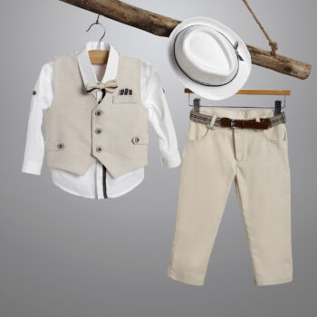 Το σύνολο συνοδεύεται με υφασμάτινο παπιόν και ψάθινο άσπρο καβουράκι με κορδέλα ίδια με αυτή που υπάρχει στο γιλέκο.