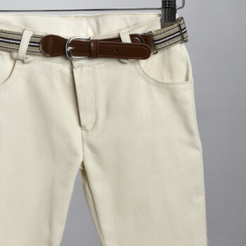 Παντελόνι καμπαρντίνα σε εκρού χρώμα. Εσωτερικά υπάρχει λάστιχο με κουμπότρυπα για τη ρύθμιση της μέσης. Διατίθεται επίσης σε άσπρο, μπεζ, βεραμάν, σιέλ, γκρι, ραφ και μπλε χρώμα. Συνοδεύεται από ελαστική ζώνη.