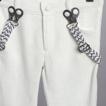 Παντελόνι ραμί σε εκρού χρώμα. Εσωτερικά υπάρχει λάστιχο με κουμπότρυπα για τη ρύθμιση της μέσης. Διατίθεται επίσης σε μπεζ, γκρι, πράσινο και σιέλ χρώμα. Συνοδεύεται από πλεκτές τιράντες.